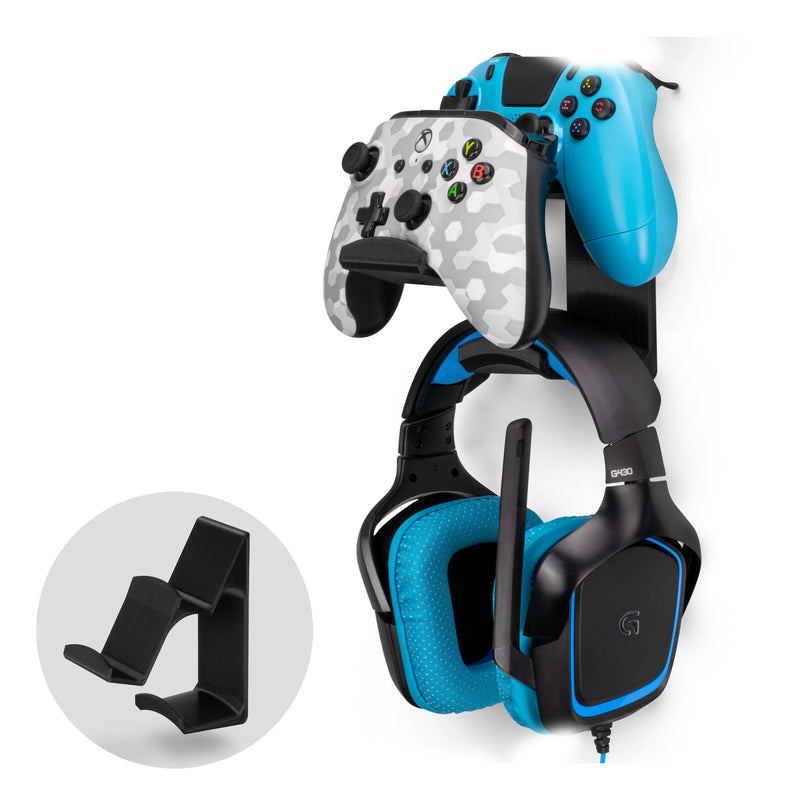 Wall mount your game controller and headphone! The only wall mount which will hold 2 controllers and 1 headphone. Works with Xbox One, 360, Playstation PS4, PS3, Nintendo Switch, Steam Controller, Desktop PC Gamepads and most other third party made game controllers. Suitable to hold most headphones of any size.
